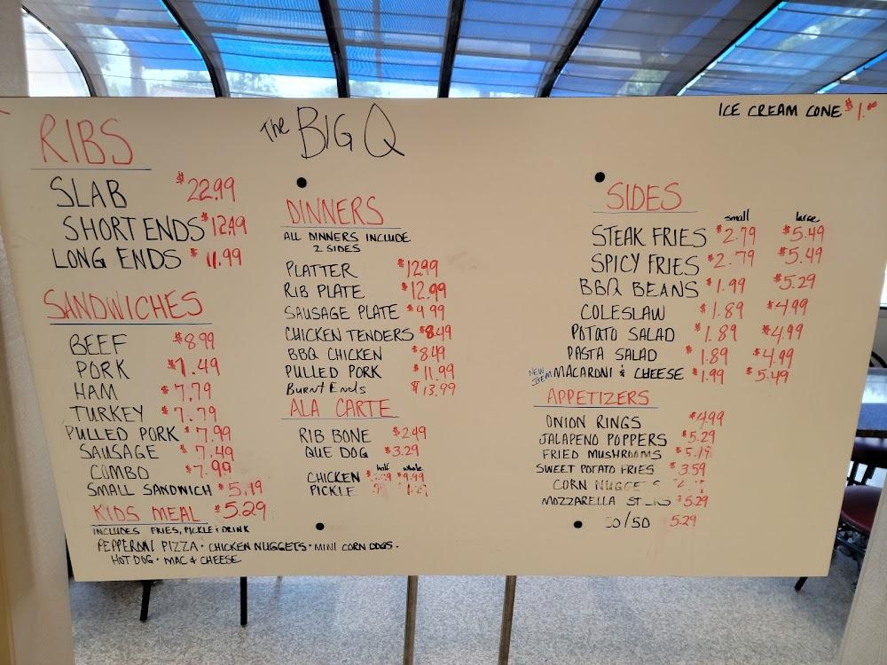 The menu at Big Q Barbeque is extensive, filled with classic BBQ dishes. Popular options include rib plates and beef sandwiches. Their signature rub combines spices that bring out delicious smoked flavors. Small plates, appetizers like fried pickles, and onion rings make for great starters.